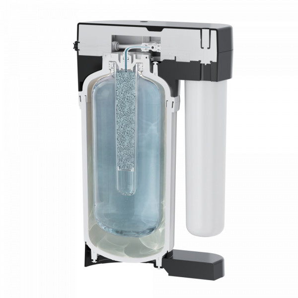 Минерализатор интегрирован в накопительную емкость. Такая конструкция обеспечивает равномерное и стабильное обогащение очищенной воды полезными минералами.